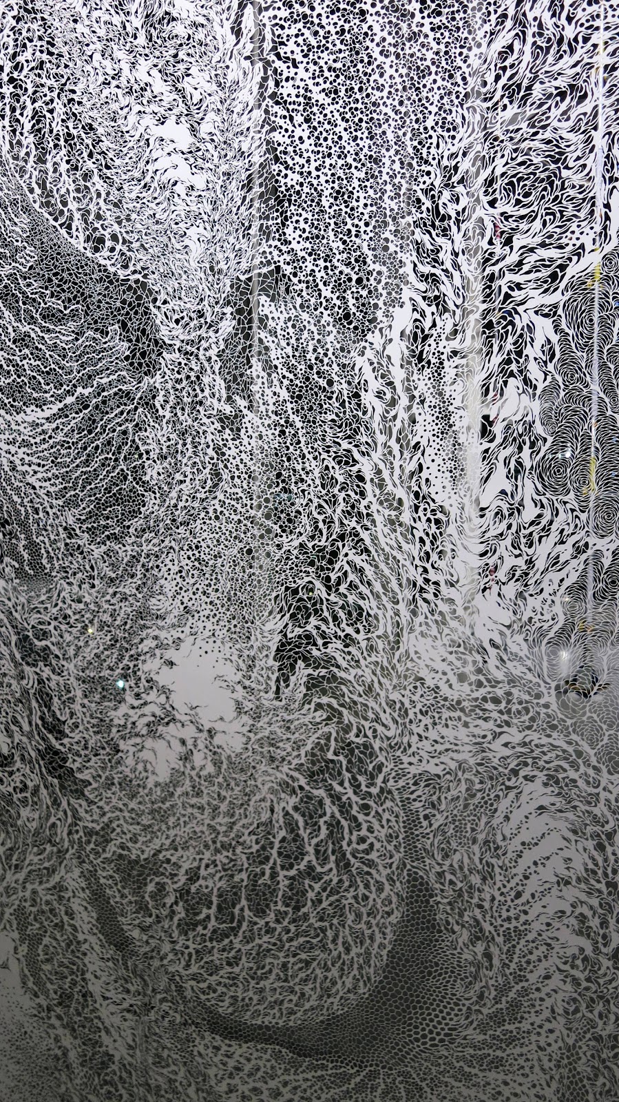The most impressive work is that of Shioyasu who has created an exquisitely detailed paper-cutting scroll, so tall that it seems imposible to have been made by hands (The photos don't quite render justice to his uber delicate work!). Here she transforms the traditional decorative medium of Kiri-e into a dynamic harmony of patterns emulating natural elements such as water droplets, bubbles and cells. The large scroll , eight meters in length and two meters in width, floats in the exhibition space just as its title “Flowing Sky” refers and also cast an interest shadow at night. Her other piece, “Bubbles” , a three-dimensional collage of round shapes made with pierced holes in synthetic paper, is as beautiful, floating freely in an acrylic case. Definitely an artist I want to see much more of!
